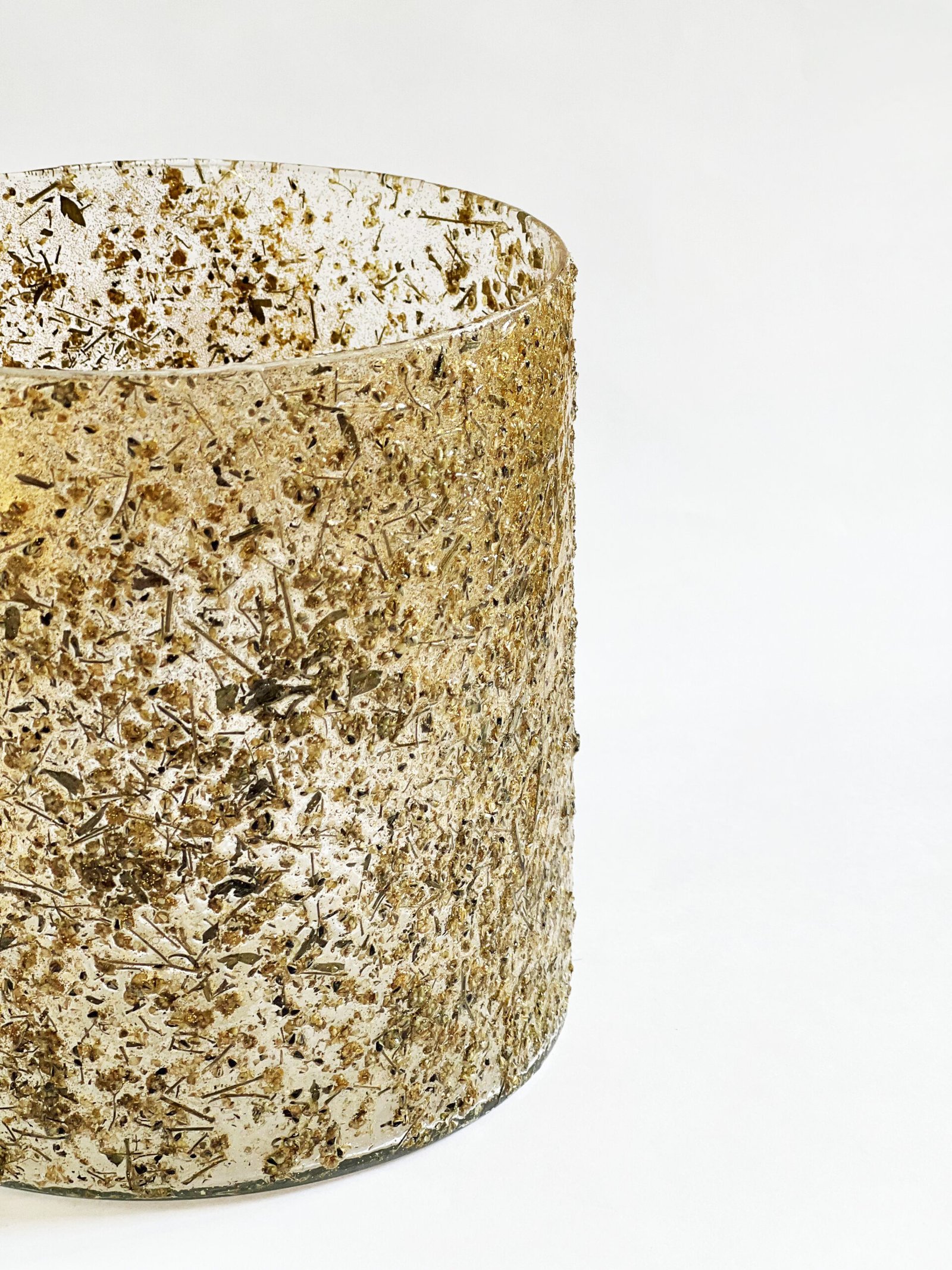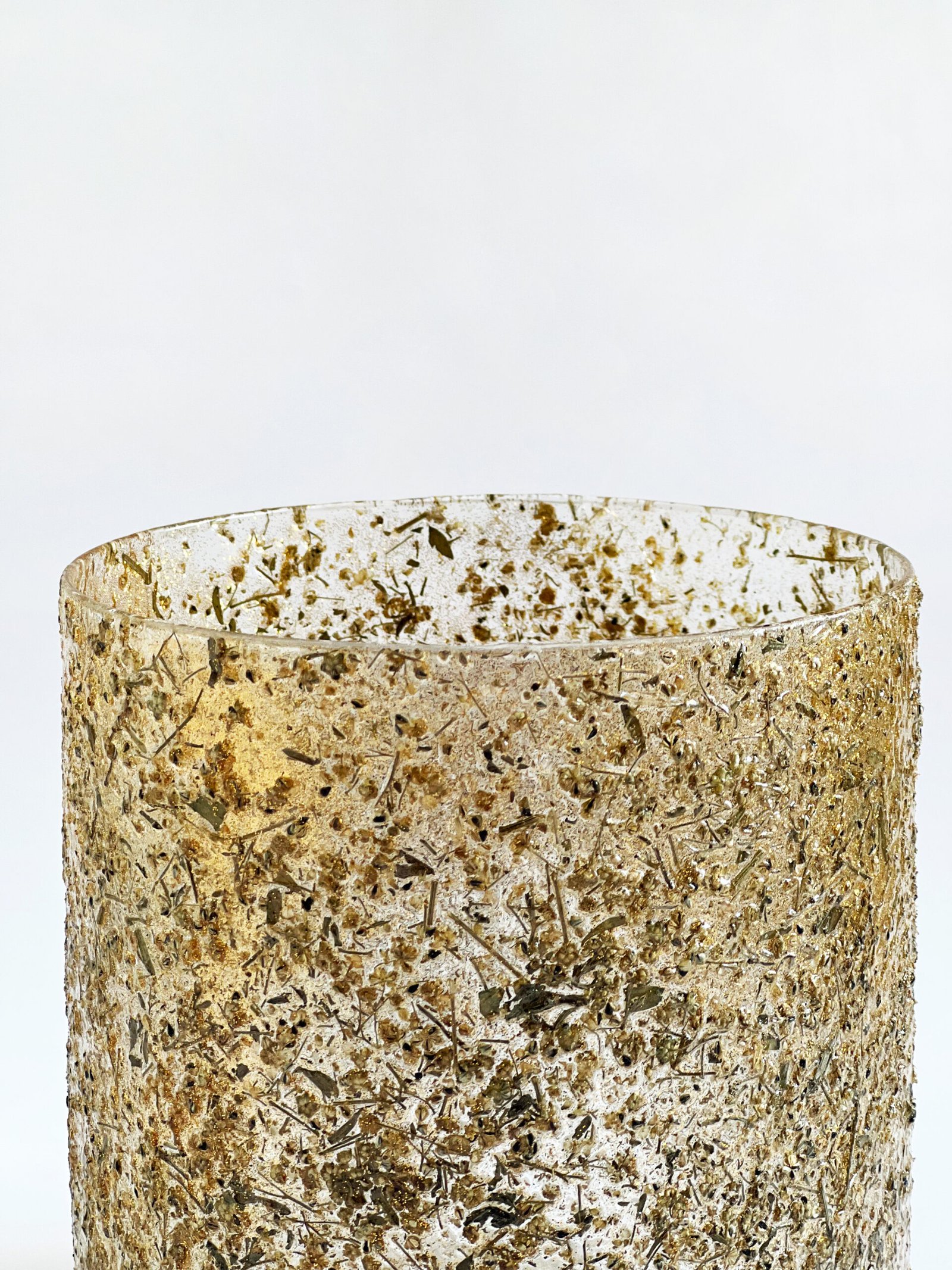 Enhance your space with the Textured Pale Old Gold Glitter Votive Glass Cylinder, radiating timeless elegance. The delicate gold ice hue adds warmth, making it a captivating accent for any setting.