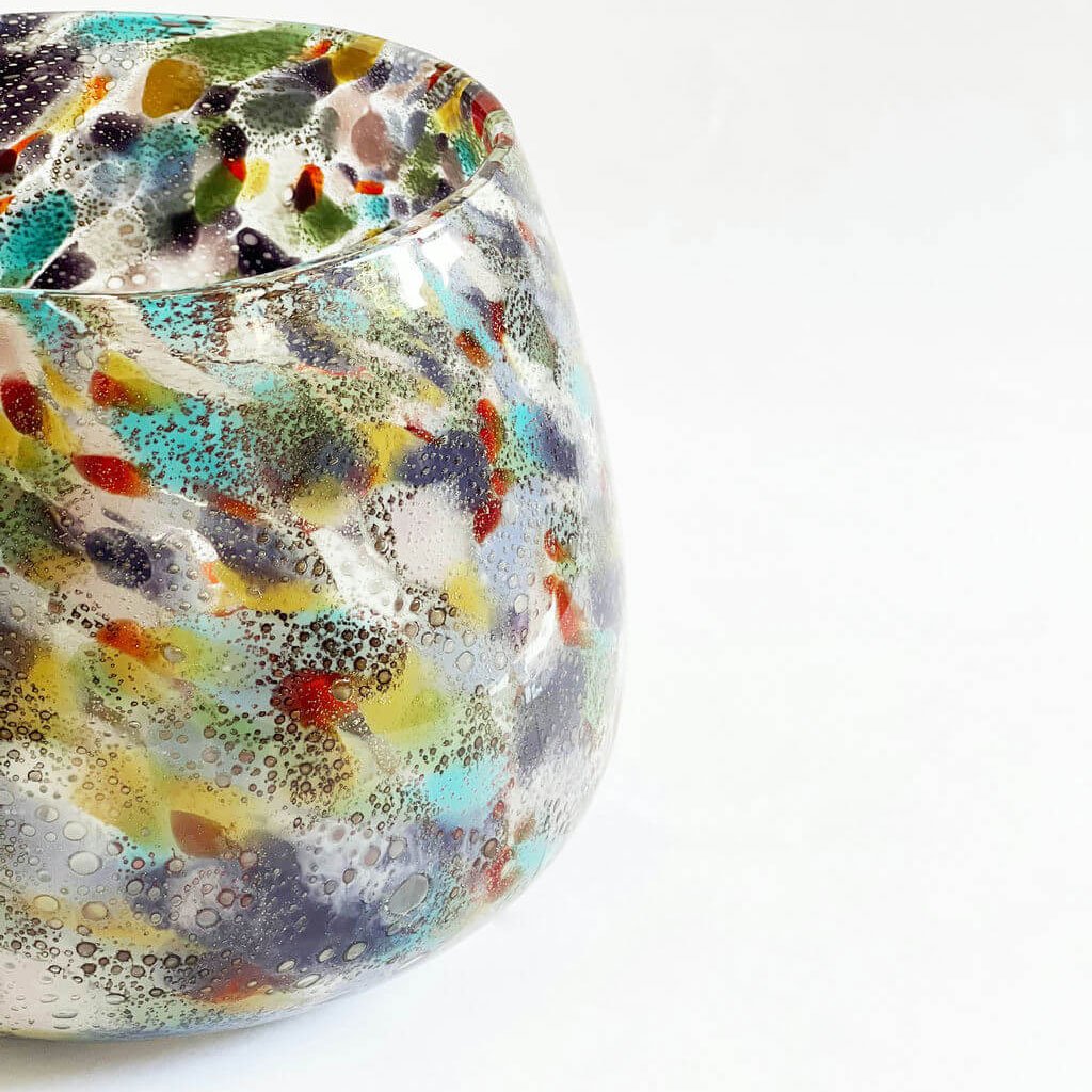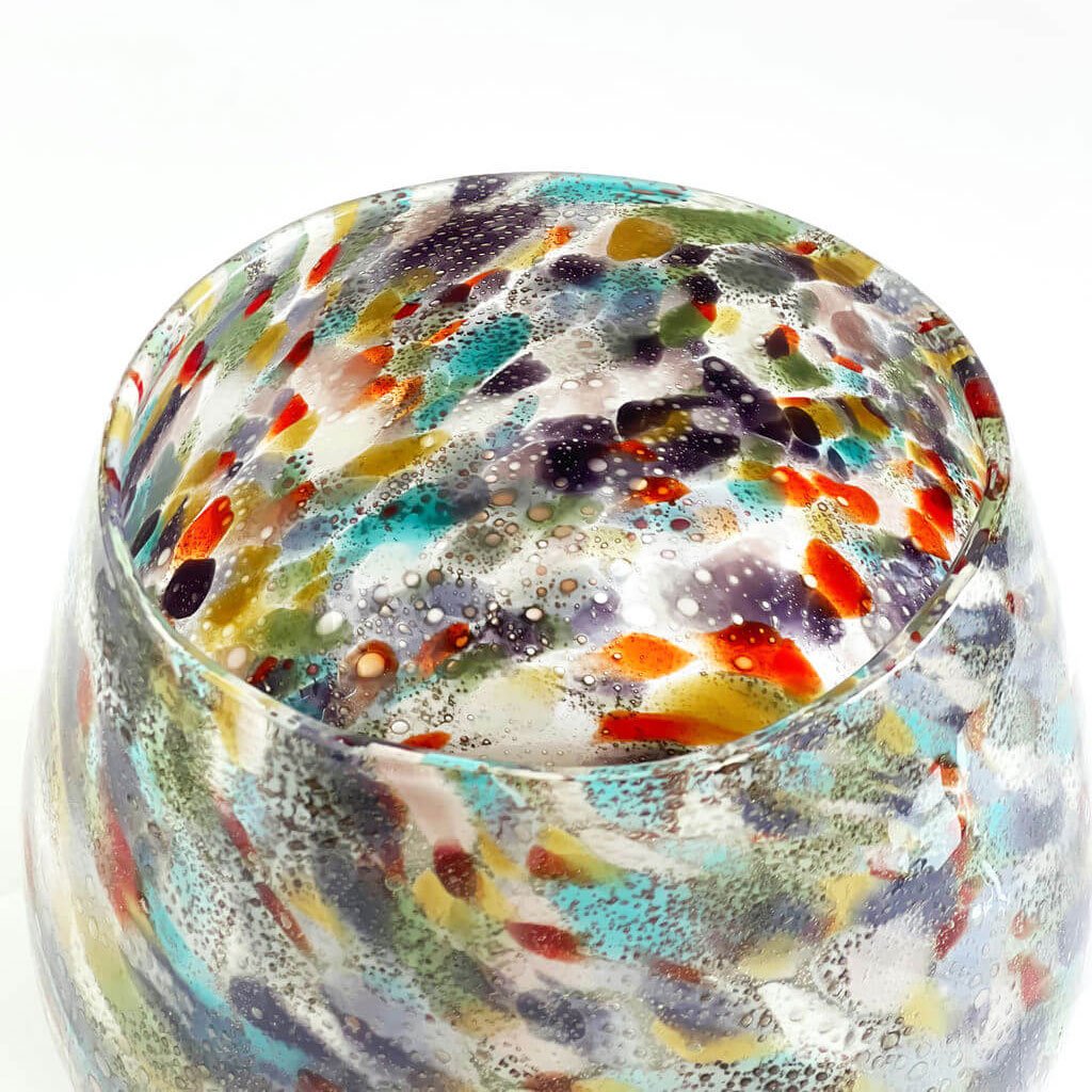This handblown clear glass vase, inspired by Murano’s ‘Goto’ glass tradition, is a kaleidoscope of vibrant colors, meticulously applied by master artisans, blending classical elegance with contemporary allure.