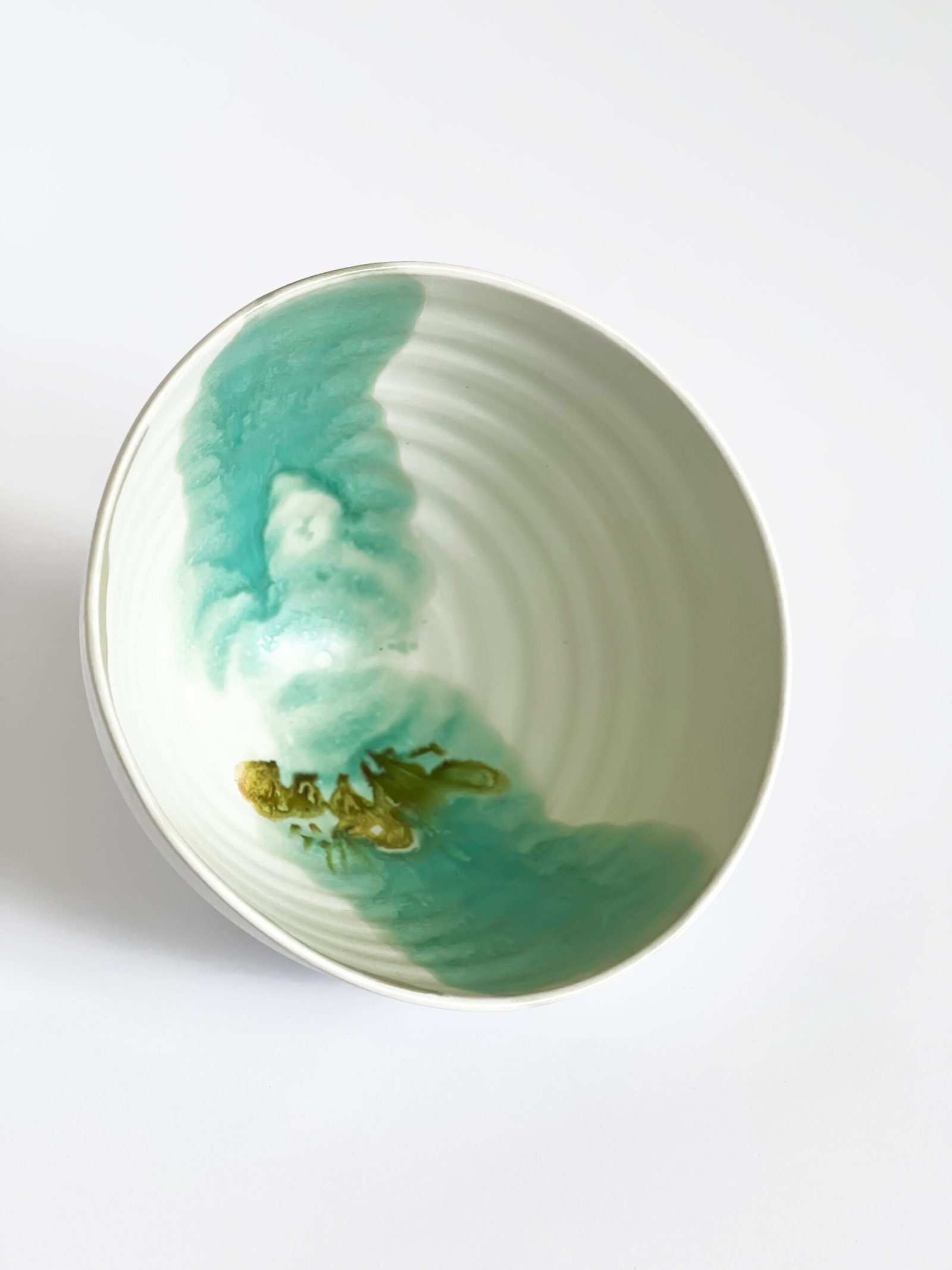 Introducing the “Sky Blue Shimmer” bowl, a captivating piece that exudes elegance and charm. Crafted with meticulous attention to detail, this exquisite bowl mesmerizes with its ethereal beauty reminiscent of a clear sky on a tranquil day.
